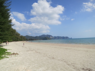 With over half the day gone pounding the pavement and searching, it was time for som R & R. We hopped aboard a Tuk Tuk and headed to Noppharat beach which is just past and around the point form Ao Nang beach. There is a beach, more or less, on either side of the town.