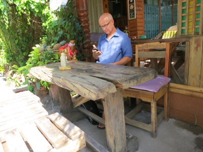On the way back we stopped in at the "Coffee in Love" shack for breakfast. Fried eggs and bacon for Moi, Marie with a healthier choice of yogurt and cornflakes. As we were sitting chatting to an interesting fellow from Sweden ( turns out he is married to the owner, a delightful Thai woman) a small gecko launched a sneak attack on my plate. At least he thought he was being sneaky, so funny. He crept along the table top to the edge of my plate and then bent his body around the rim, grabbed a mouthful of the remaining egg yolk, and ran. We tried to get a picture but I think he was on to us.